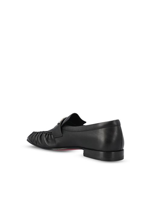 يتميز حذاء Mocallista الرجالي من دار كريستيان لوبوتان، وهو حذاء أنيق ذو طابع كلاسيكي، بلسانه المزين بشريط ذهبي يحمل عملة معدنية مختومة بشعار الدار.