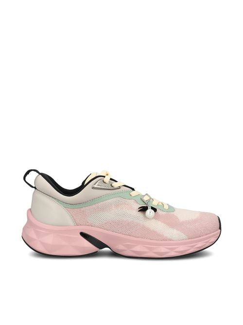 حذاء جيمي تشو دايموند رن-إف الرياضي مصنوع من نسيج الجاكار المحبوك، ويتميز بتصميم ديناميكي وخطوط منحوتة تُحدد جمالية هذا الطراز الأيقوني. يُضفي التصميم العصري وملمس النسيج على الحذاء هوية قوية وراقية.