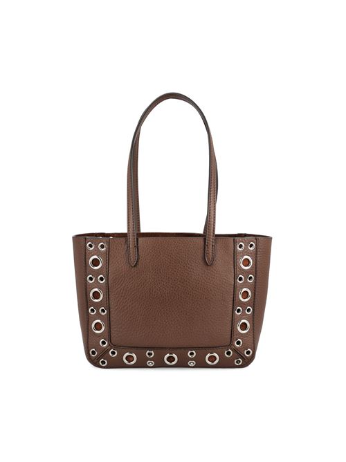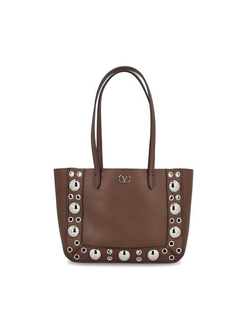 حقيبة تسوق صغيرة من فالنتينو غارافاني "نيلكوت" مصنوعة من جلد العجل المحبب، متوفرة بلون بني أنيق. تتميز بتصميمها المدمج والمنظم، وتعكس أناقة عصرية من خلال خطوطها الحادة وتفاصيلها المميزة.