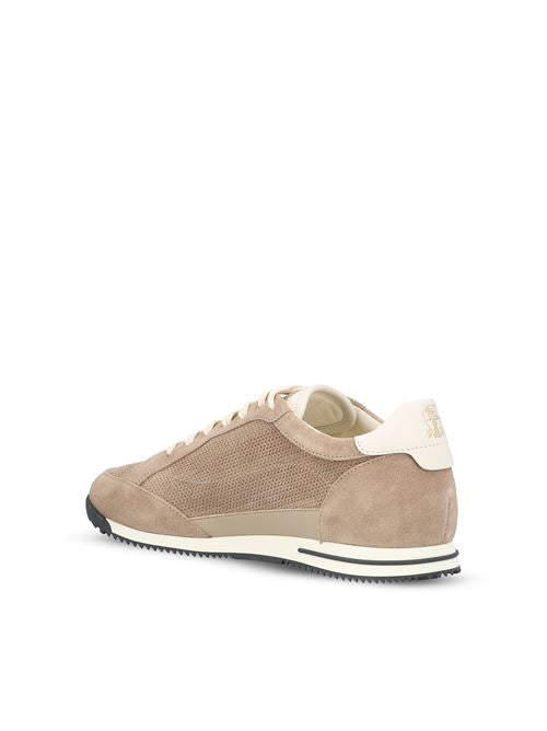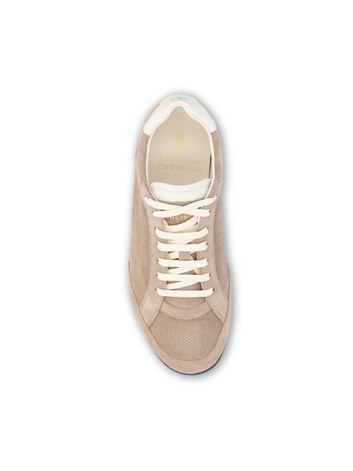 Brunello Cucinelli low-top sneakers made of suede with leather trim, characterized by a refined construction and an elegant balance between soft materials and careful details. The essential design and clean proportions define a contemporary shoe, an expression of the brand's sophisticated and timeless aesthetic.