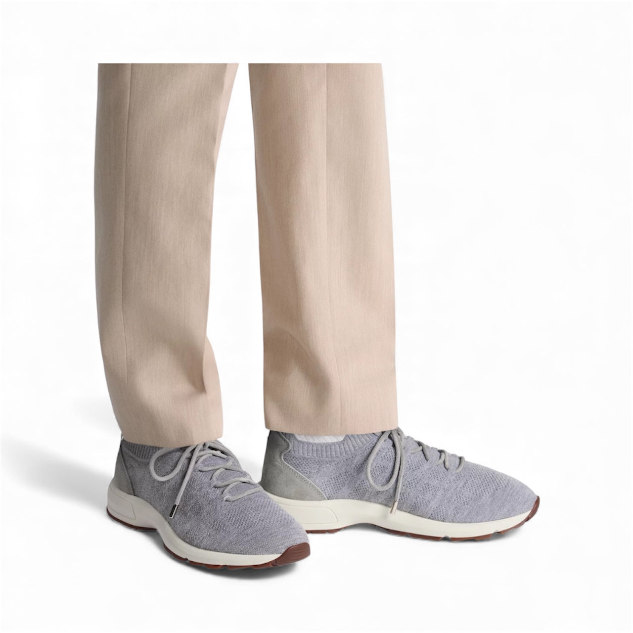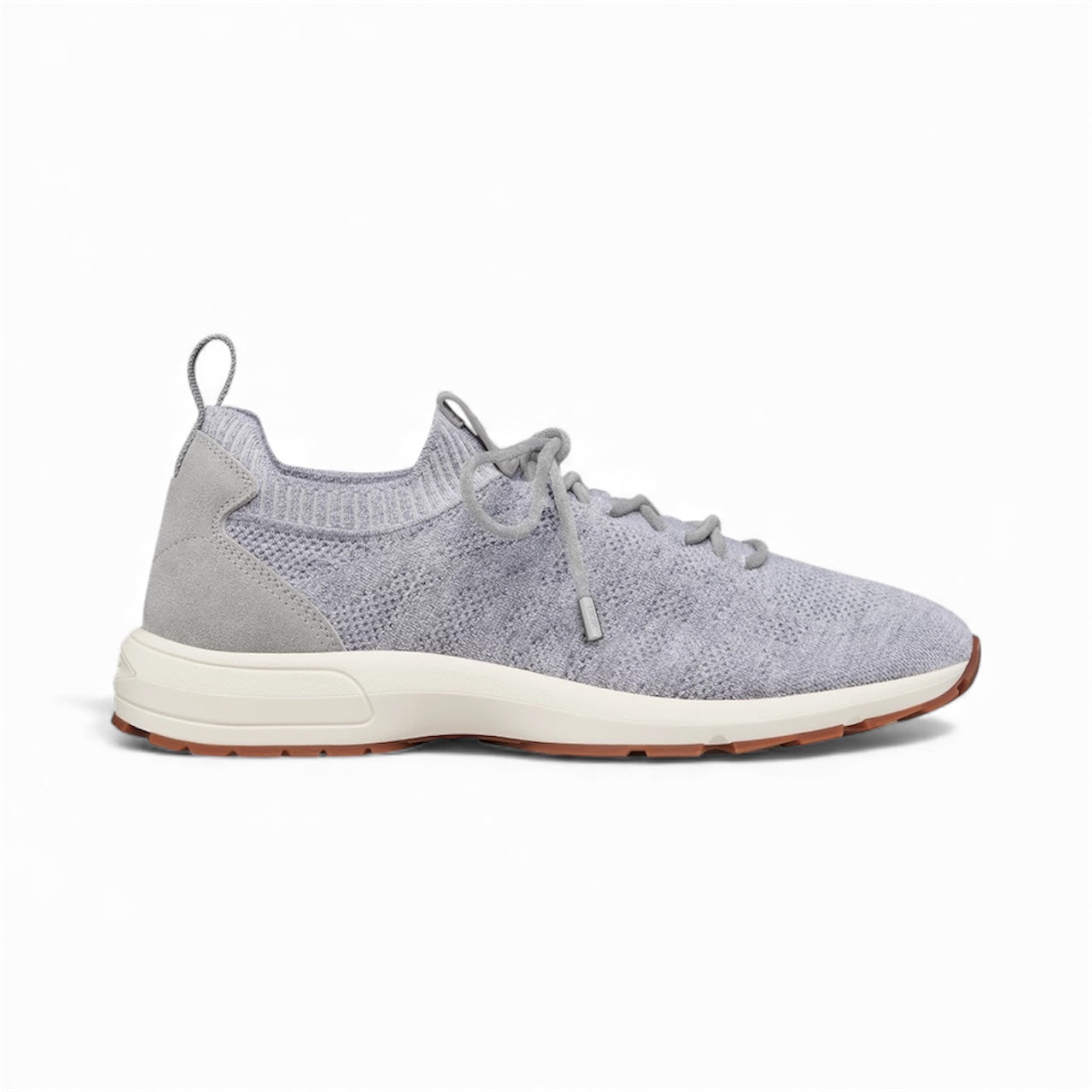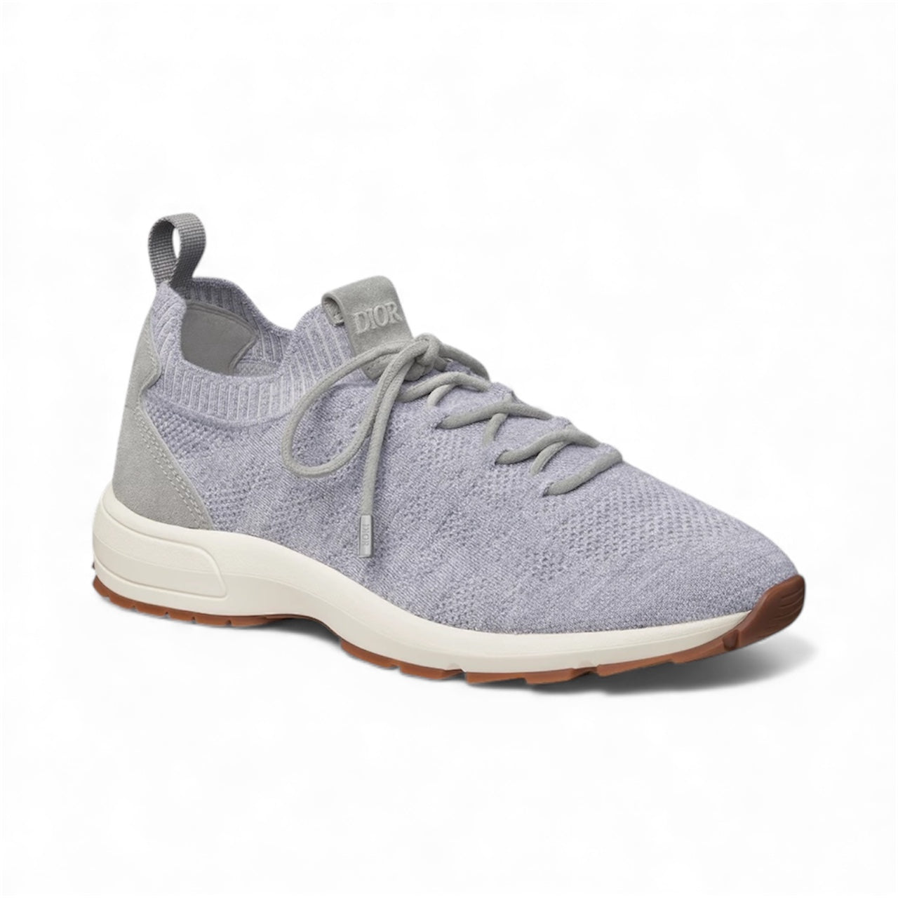 New for Winter 2025, the B80 Lounge sneaker is distinguished by its streamlined silhouette and details inspired by Dior's couture spirit. Crafted in a Dior gray cashmere, wool and silk knit subtly showcasing the House's iconic Cannage motif, the style is enhanced by a tonal suede panel in the back and a Dior-embossed patch on the tongue. Combining a lightweight feel with optimal comfort, the design features an elasticated collar, rear tab and decorative suede laces allowing it to slip on easily. Completed by a thick, notched and sculpted rubber sole with the Dior signature, the B80 Lounge sneaker will pair with any look in the Dior Icons capsule.