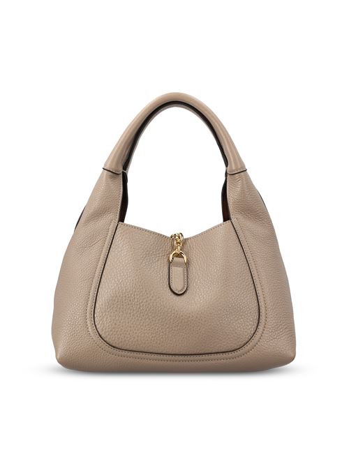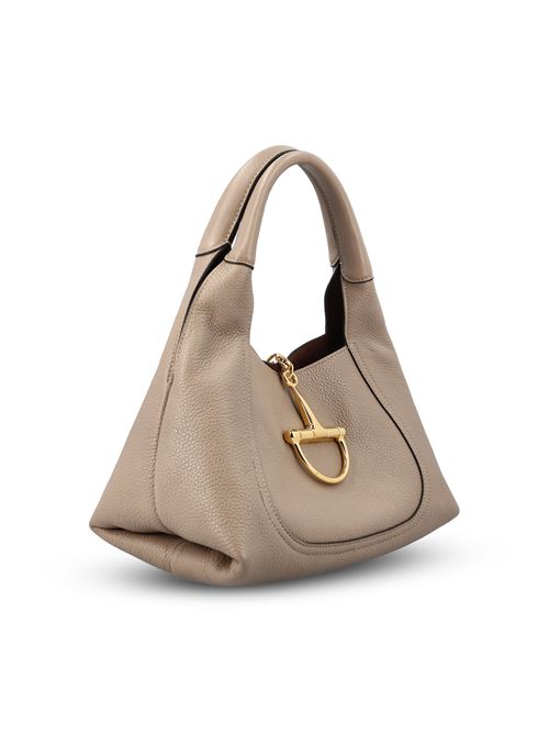 Bag made of leather, characterized by a soft silhouette and an essential design defined by rounded lines. The metallic detail on the front enhances the aesthetics of the model, expressing a contemporary and recognizable elegance.