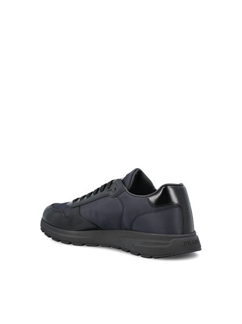 Prada's sneakers in Re-Nylon and black leather combine sporty aesthetics and innovative materials. Made of regenerated Re-Nylon fabric with smooth leather inserts, they feature a modern silhouette with a rubber sole and enameled metal triangle logo on the side. An urban and refined model that expresses the perfect balance between technology and contemporary luxury.