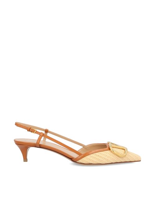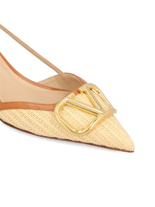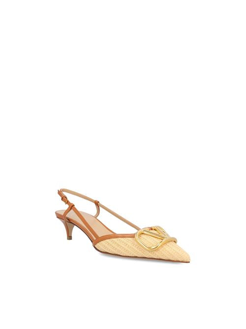 Valentino Garavani pumps characterized by a raffia construction with leather details that define a refined and contemporary aesthetic. The model features a tapered line, mid-heel and iconic VLogo detail applied as a distinctive element.
